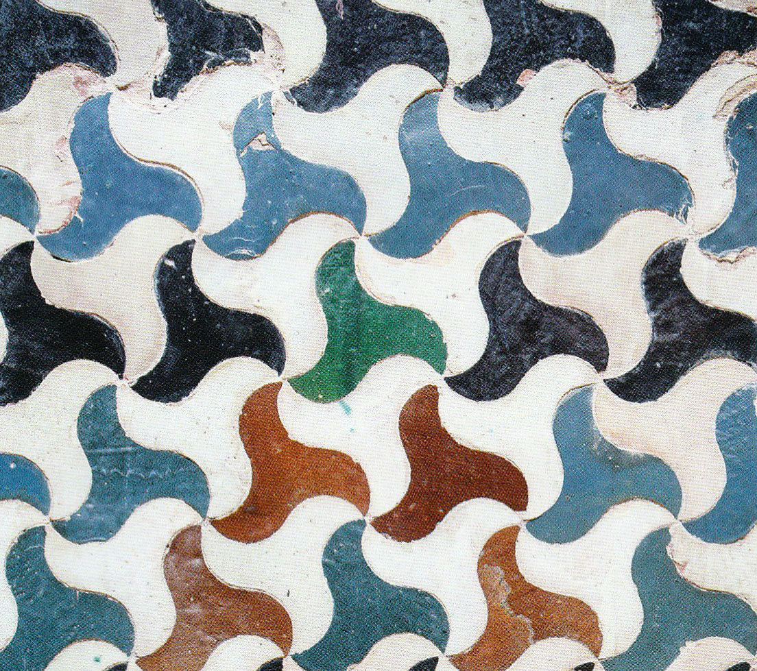 Can you see how Escher used the pattern in this Alhambra tile as inspiration for Day and Night, one of his most famous tessellations? The black birds are flying into day while the white birds are flying into night.