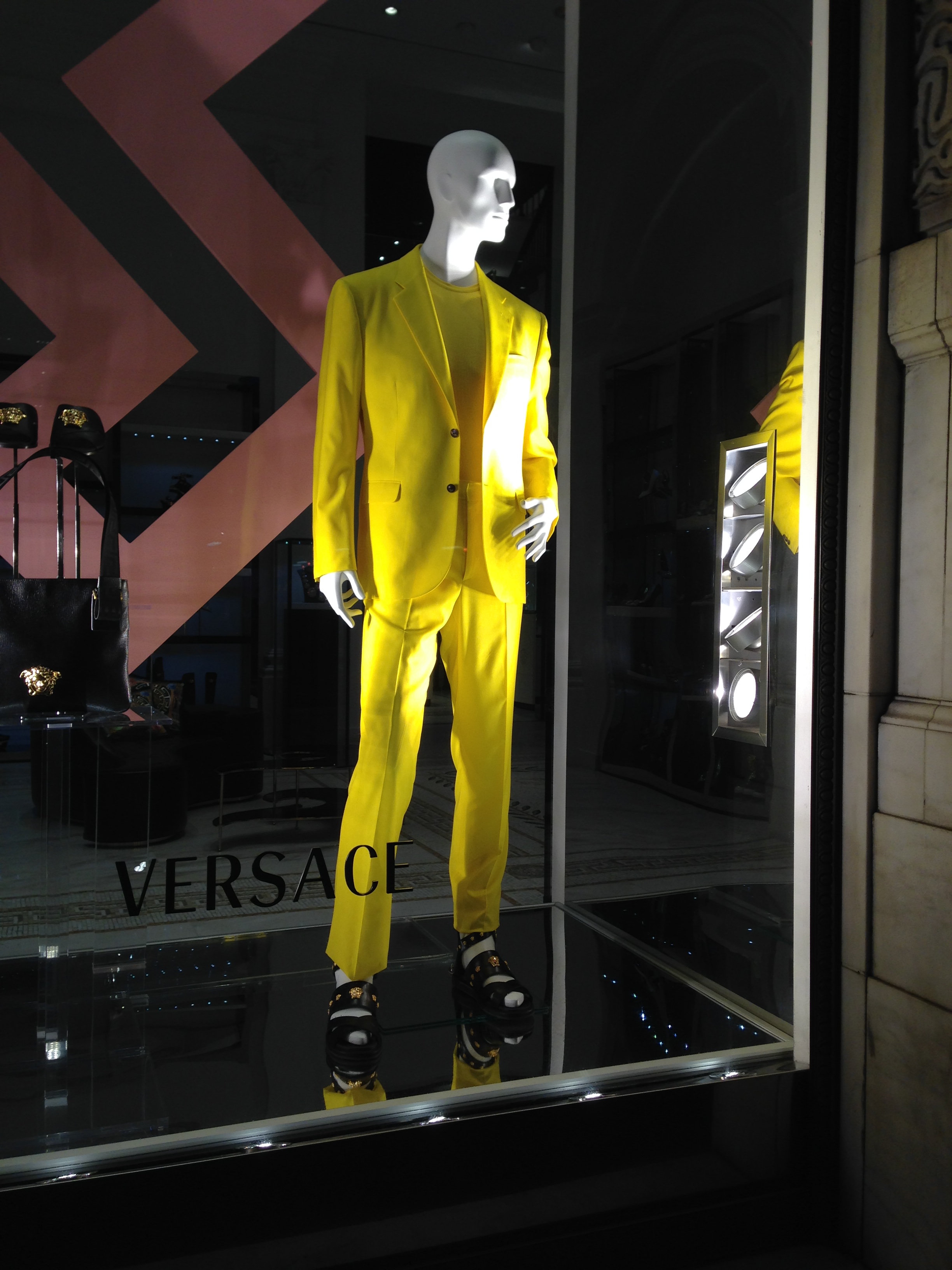 This screaming yellow suit in the Versace window is not photoshopped.