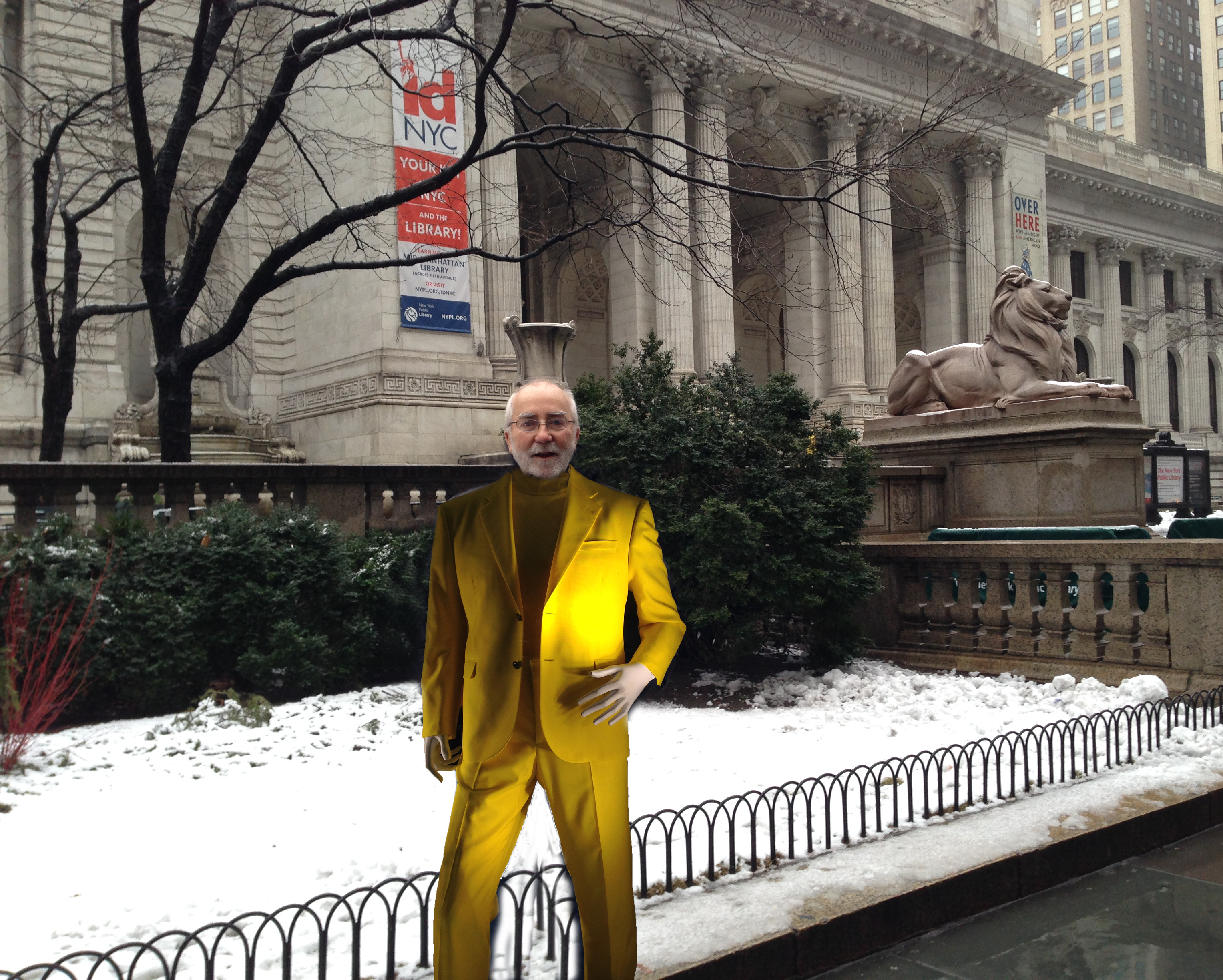 That Versace Yellow-Suit-Man walked out of the store and strolled the streets of New York, right to the New York Public Library. This is the photo to prove it.